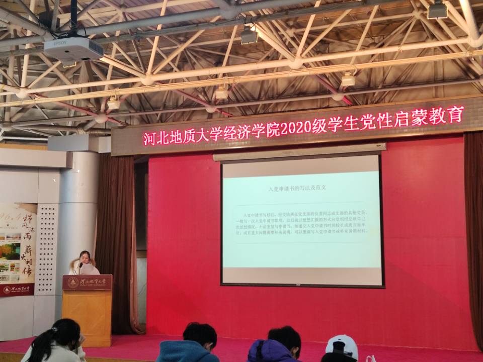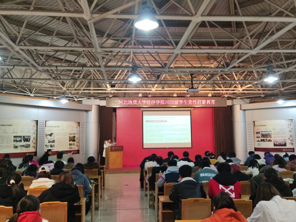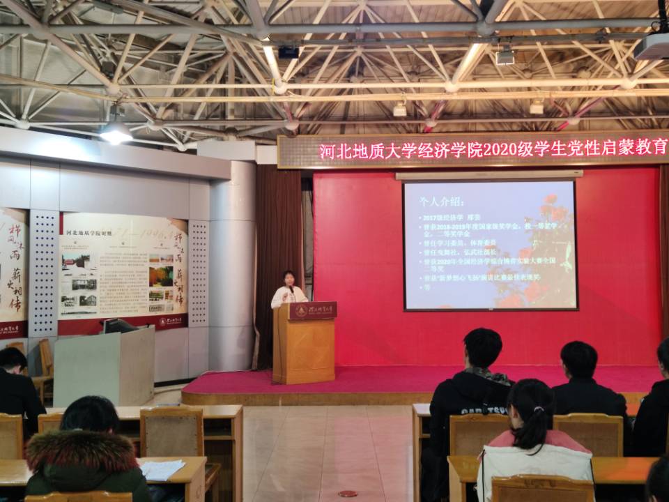 为了进一步加强2020级新同学对党的认识和了解,激发全体同学的入党积极性,详细了解入党流程,端正入党动机,进一步夯实和扩大学生党建工作的基础,11月25下午2点,经济学院在科技报告厅召开了“河北地质大学2020级学生党性启蒙教育”主题活动。学生第一支部副书记董晨阳、宣传委员鲍天璞及党员代表邢芸给大家带来内容丰富入党启蒙教育课。学生第一党支部书记蔺丽军老师和郭晓娜老师以及2020级全体新生参加本次党课教育。