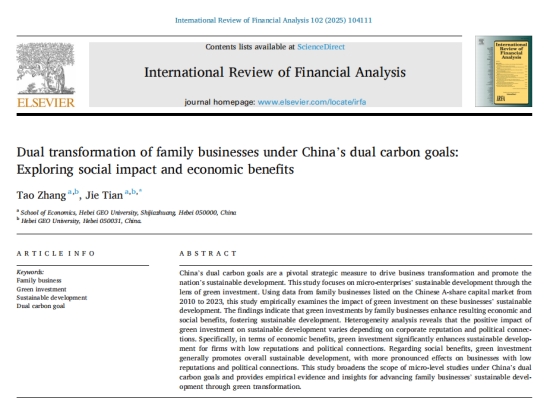田杰副教授与硕士研究生仉涛合作论文《Dual transformation of family businesses under China's dual carbon goals: Exploring social impact and economic benefits》于《International Review of Financial Analysis》发表。