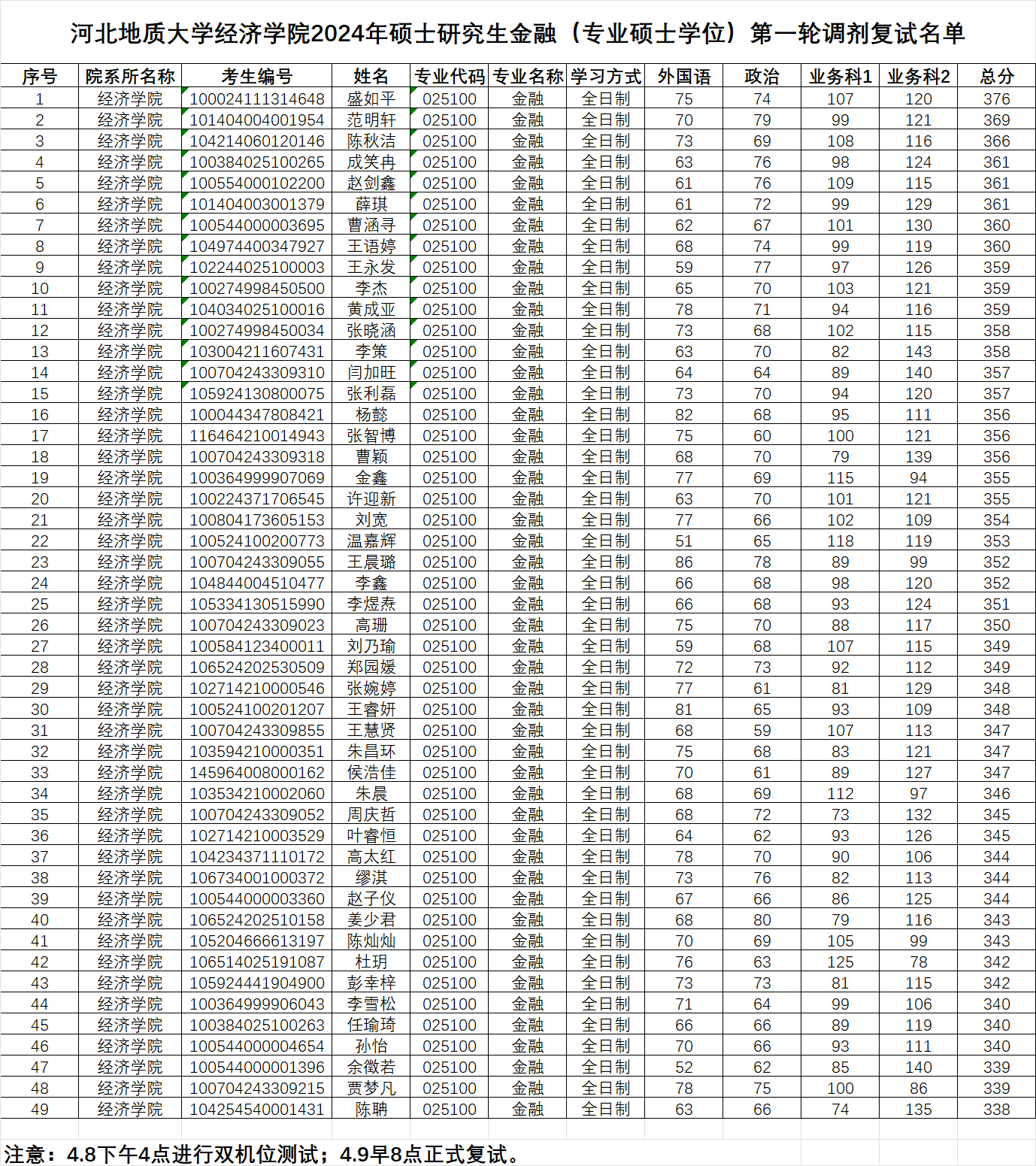 河北地质大学美女成人视频 2024年硕士研究生金融(专业硕士学位)第一轮调剂复试名单