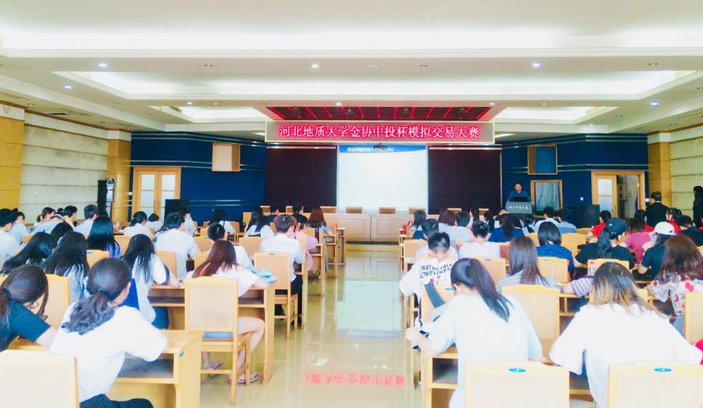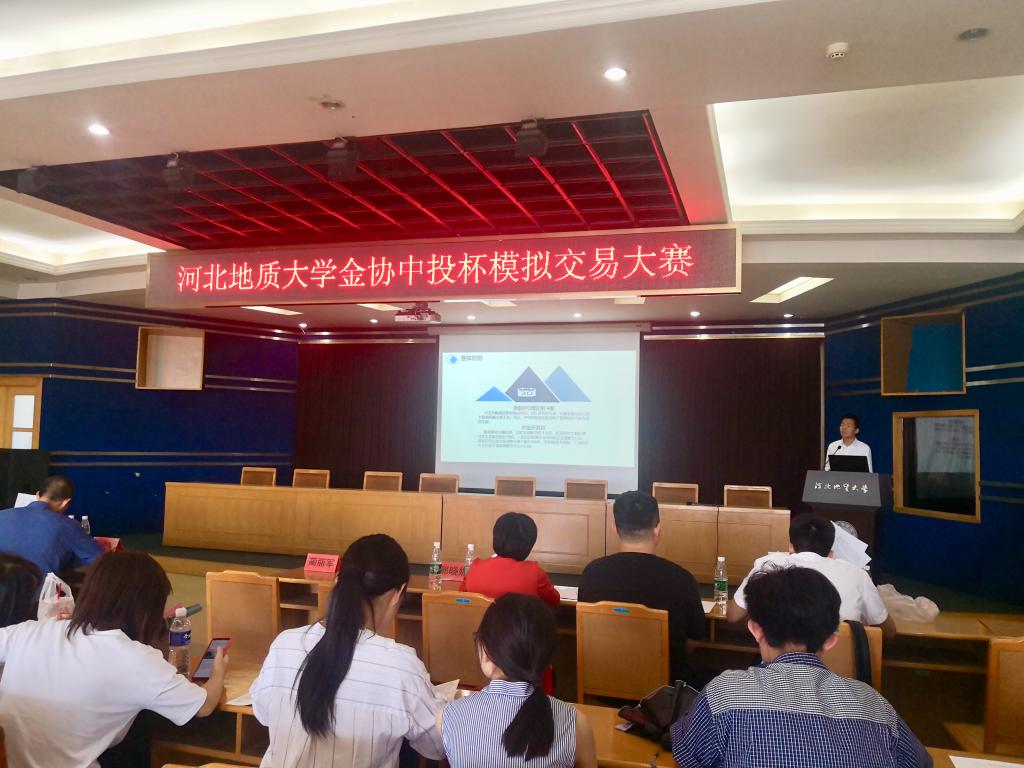由河北地质大学金融证券协会和经贸学院学生科协主办的中投杯股票模拟交易大赛闭幕式于5月23日下午在学术报告厅举行。中国中投证券有限责任公司总部高级分析师刘中华先生,北京分公司王汉丞、李建军先生,经贸学院蔺丽军老师、郭晓娜老师、曹丽娜老师出席此次闭幕式。到场的观众还有来自不同学院不同年级的参赛选手们。