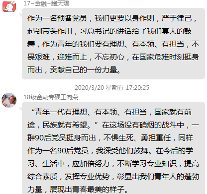 随后,蔺丽军老师在线上与同学们分享学习感悟,说到“作为当代大学生应该不忘学习初心,牢记为祖国奉献使命,努力学好本领,争当新时代青年。”大家纷纷回应,表示要深入学习贯彻习近平总书记回信重要精神,不忘初心、牢记使命,勤奋学习,砥砺品质、增长本领,为祖国发展贡献自己的力量;与此同时,同学们还对奋战在一线的医务人员与各行工作者表示了崇高的敬意,以及对祖国深深的热爱与自豪。