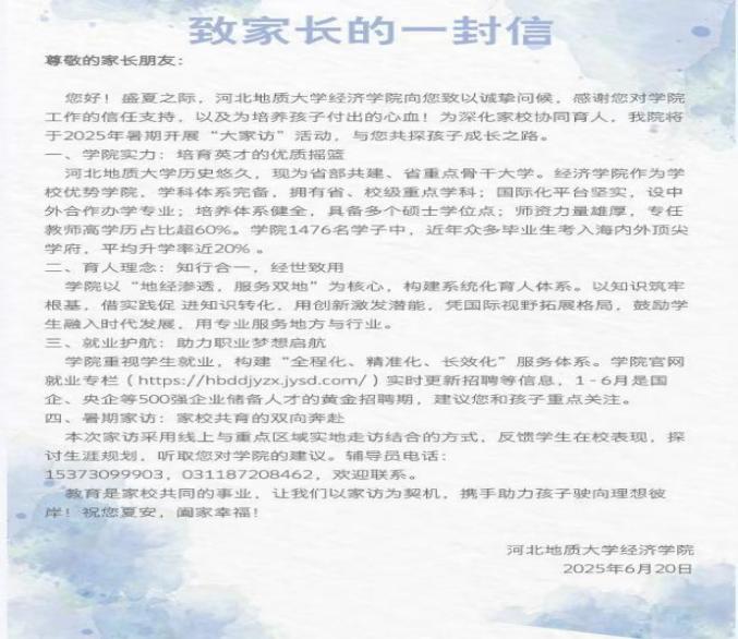 将持续打造“经英领航”党建品牌,以本次家访为起点,建立家校常态化沟通机制,推动走访成果转化为育人实效,为学校建设特色鲜明的高水平大学贡献 “经院力量”。