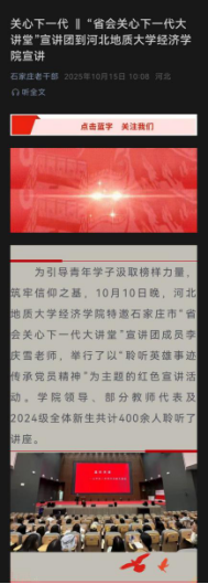 2025年10月15日,石家庄市委老干部局公众号“石家庄老干部”以“‘省会关心下一代大讲堂’宣讲团到河北地质大学美女成人视频 宣讲”为题,对美女成人视频 特邀宣讲团成员李庆雪举行“聆听英雄事迹,传承党员精神”为主题的宣讲活动进行了报道。