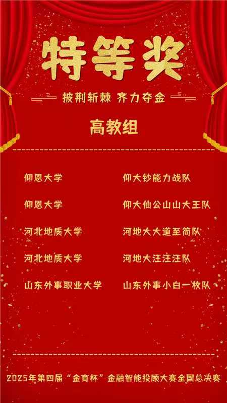 2支代表队(指导教师:孟亚君、庞岩、田杰)分别取得团体总分第三名和第四名,双双荣获高教组全国特等奖,其中郎潘依同学获得个人赛项最佳投资顾问奖,时浩和王文涛等七位参赛同学荣获个人赛项十佳投资顾问奖。