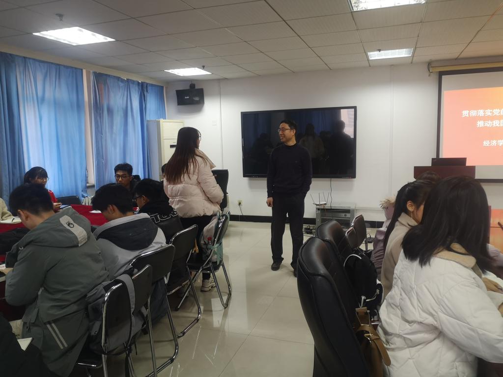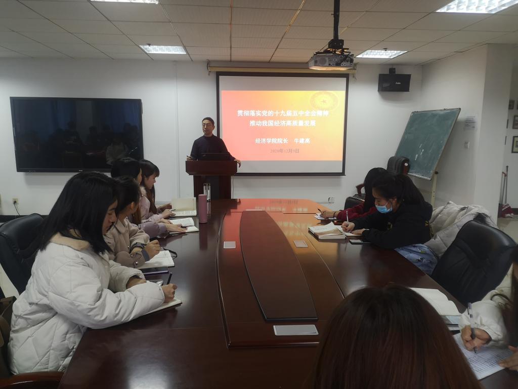 党的十九届五中全会审议通过了《中共中央关于制定国民经济和社会发展第十四个五年规划和二〇三五年远景目标的建议》,全面擘画了我国发展新征程的宏伟蓝图,是指引我们实现第一个百年奋斗目标之后向第二个百年奋斗目标进军的行动指南。为贯彻落实党的十九届五中全会精神,2020年12月9日,经济学院院长牛建高以“贯彻落实党的十九届五中全会精神 推动我国经济高质量发展”为题,同学院学生党员、积极分子共同学习了党的十九届五中全会审议通过的《中共中央关于制定国民经济和社会发展第十四个五年规划和二〇三五年远景目标的建议》,要求学院学生党员、积极分子要自觉把思想和行动统一到以习近平同志为核心的党中央重大决策部署上来,深入学习领会、全面贯彻落实。